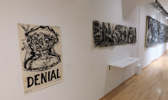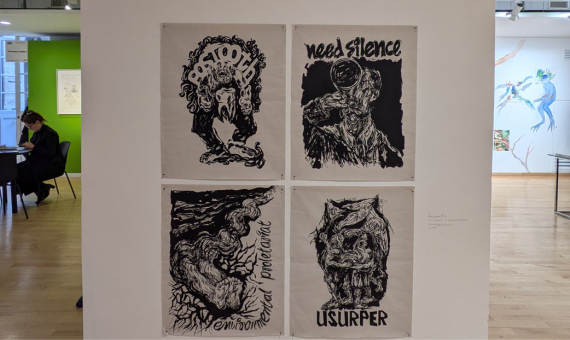 Majumdar’s poems, which often read as if they are journal entries, frequently reference local botanicals through their overlapping condition with the lives of the people in the Bengal region. This conflation of human and more than human entities opens up possibilities to counter conventional, hegemonic landscape paintings from the Bengal School of Art that romanticize and idealize continuous, unbroken stretches of pastoral and forested land, and their indigenous inhabitants. In the series of drawings, posters, zines and photo-notes on view, the artist uses the discontinuous, rhythmic, delicate line to stage partial yet affective encounters with the continuous disintegration of all that the land encompasses, including itself. By doing so, he averts the gaze of the viewers of his works from that of surveyors who claim ownership of these lands to that of its inhabitants who are immersed in the struggles embodied by the landscape and resist such totalizing approaches that mark the desire for power and control.