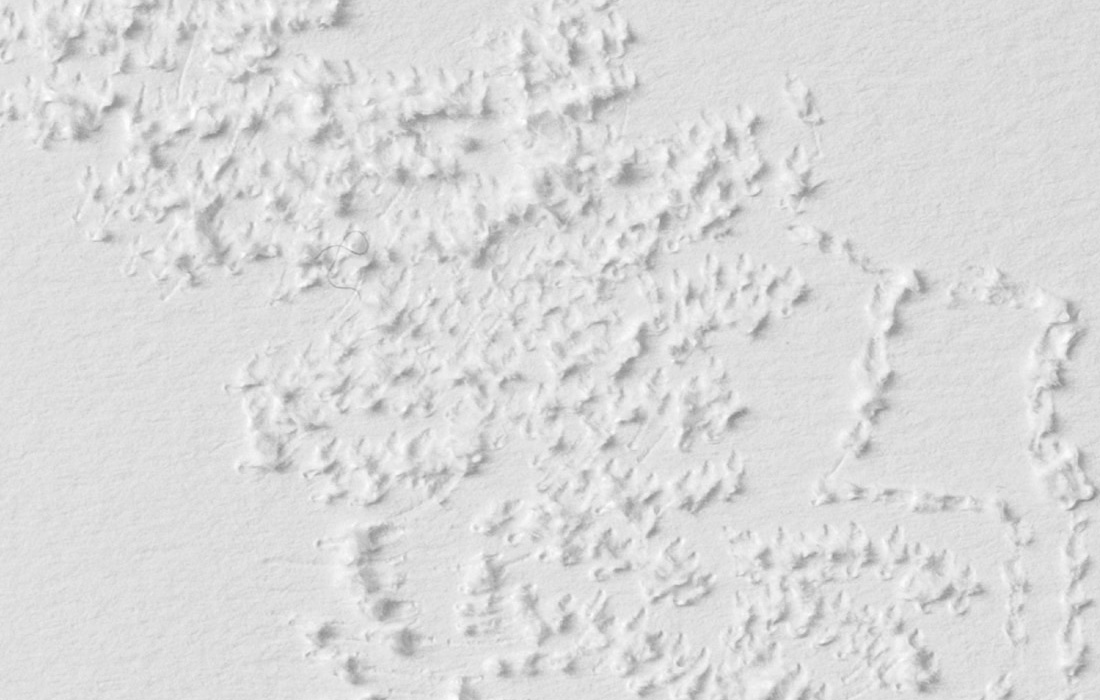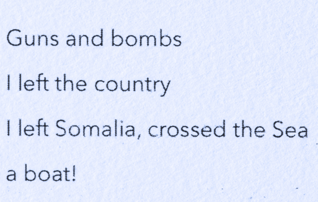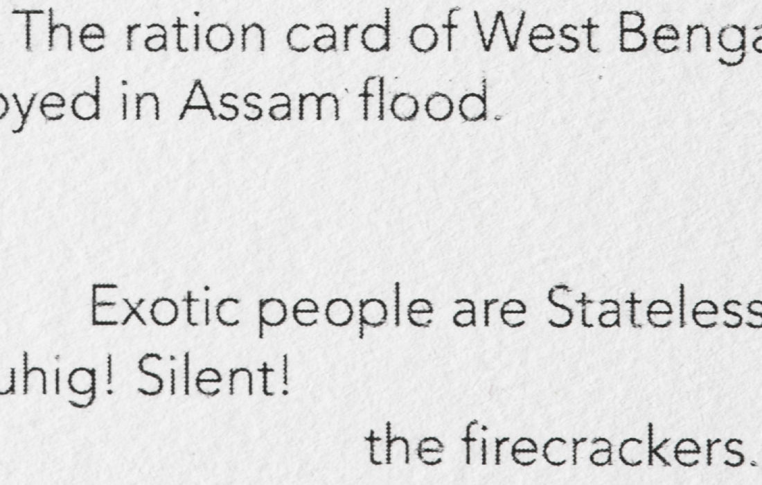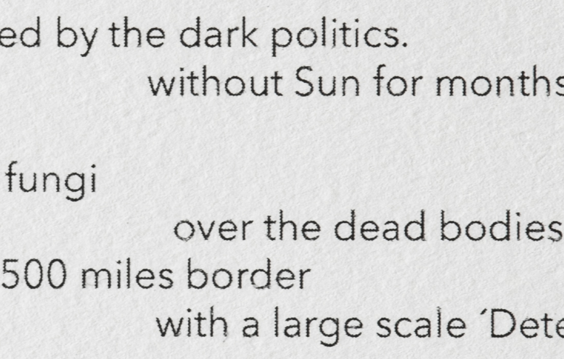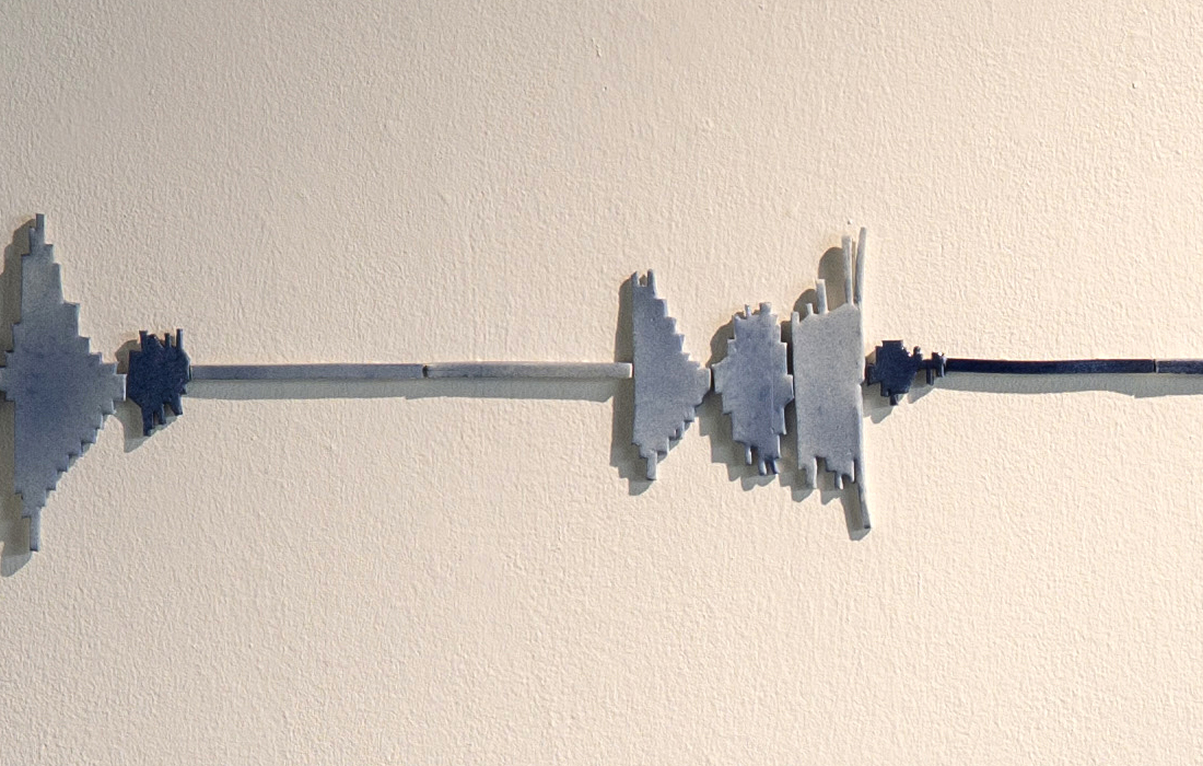 Mute Tongue, which also starts with poetry on asylum seekers: Murad, a young Somalian boy, and Anthony, a Sri Lankan national who left his home country during the Civil War, from whom Chakraborty collected stories. The sculptural work represents an audiograph of her reading the text out loud.