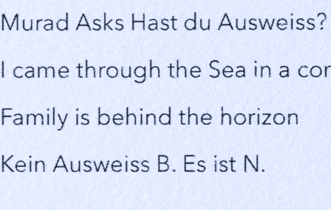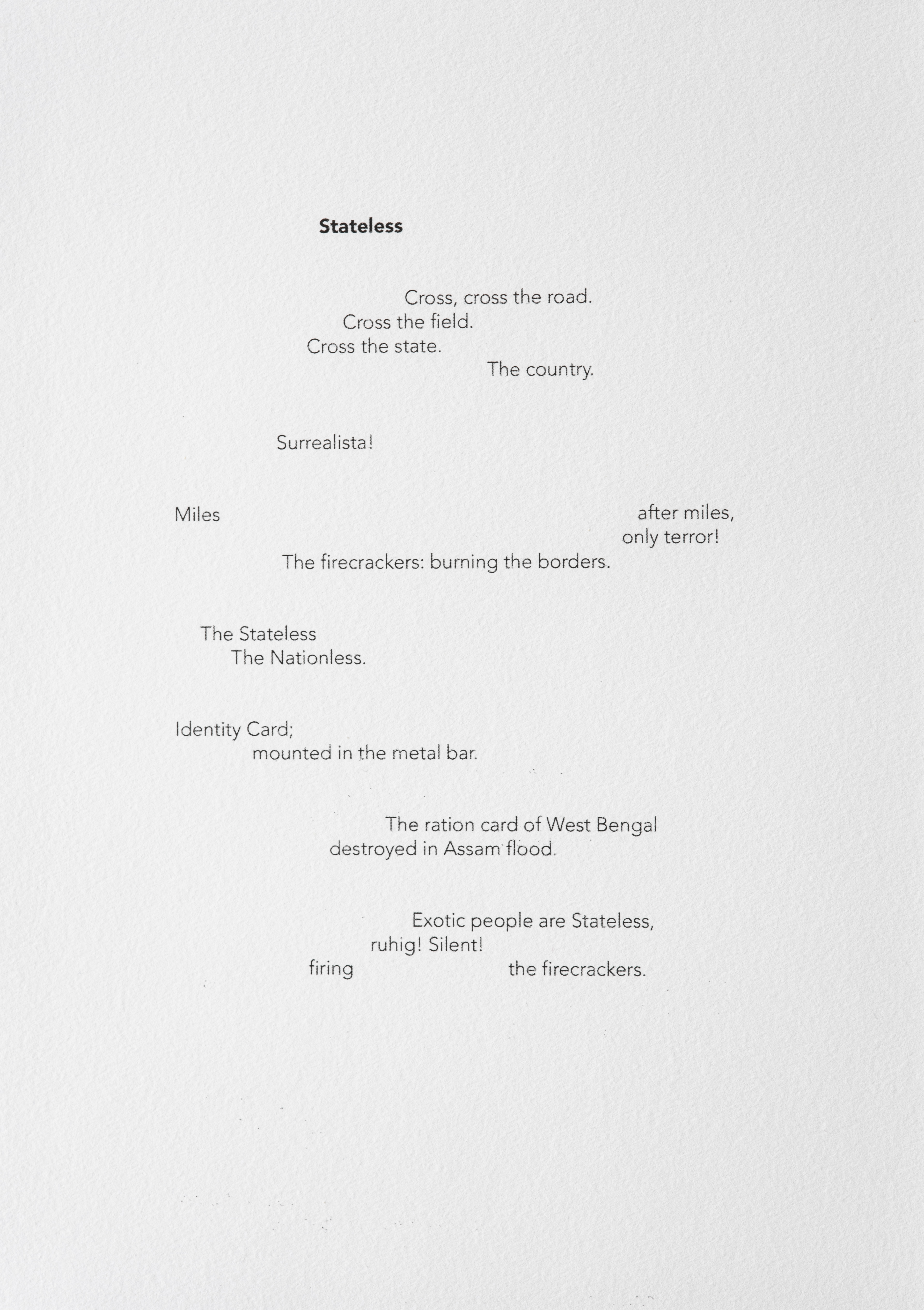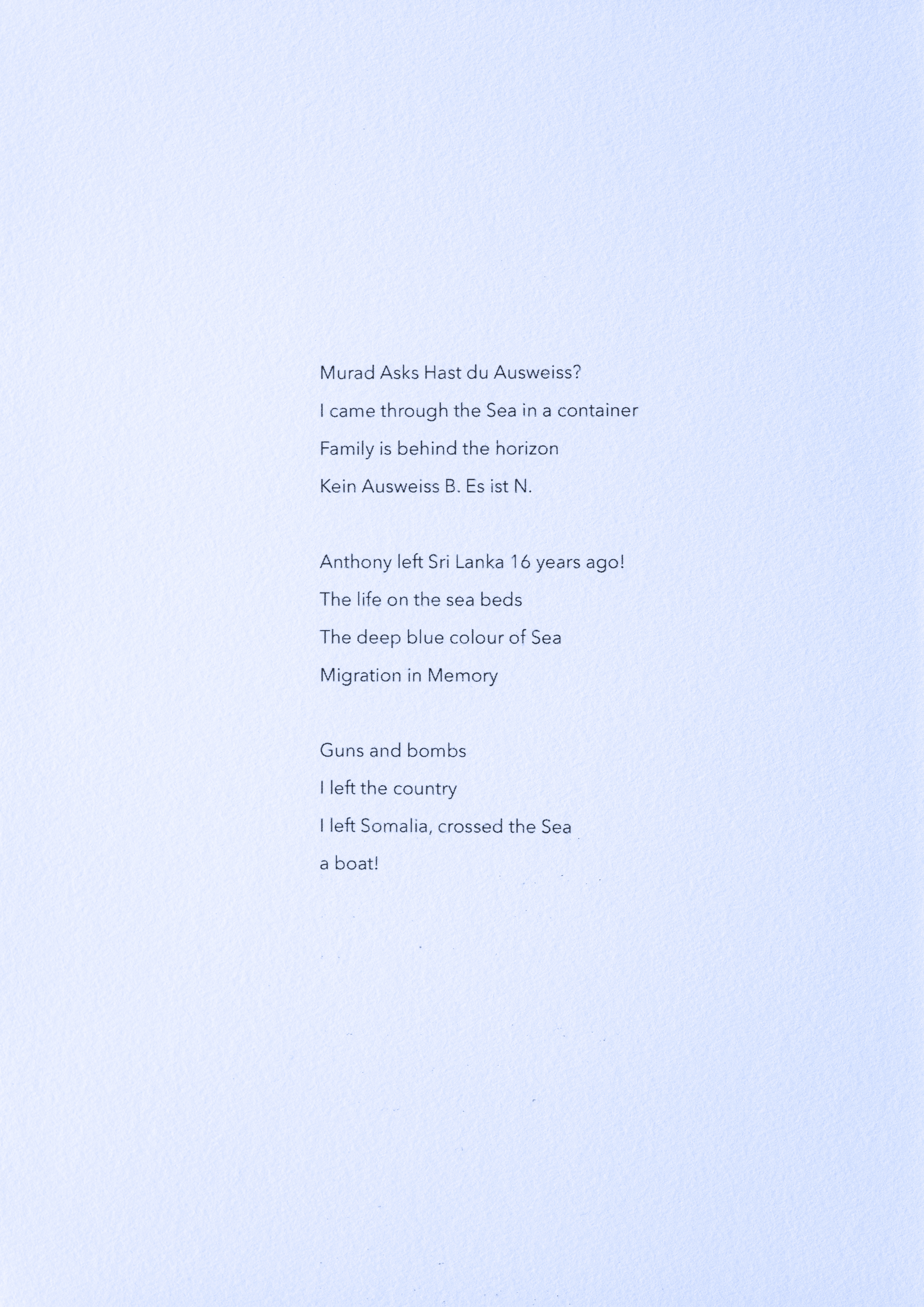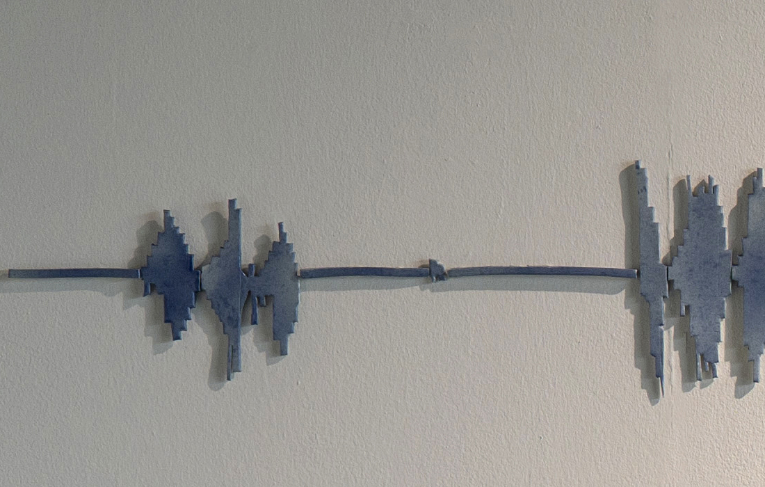 Mute Tongue, which also starts with poetry on asylum seekers: Murad, a young Somalian boy, and Anthony, a Sri Lankan national who left his home country during the Civil War, from whom Chakraborty collected stories. The sculptural work represents an audiograph of her reading the text out loud.