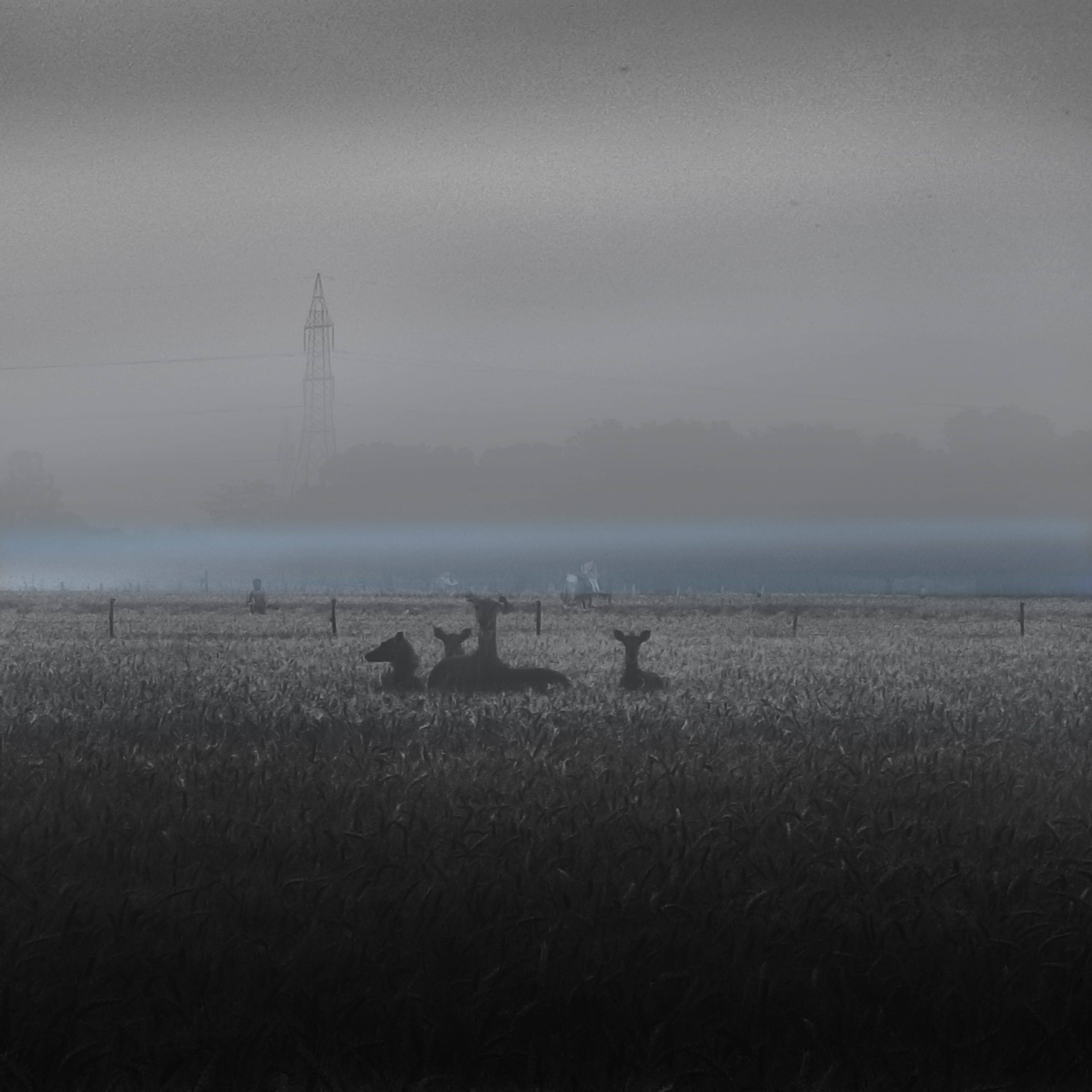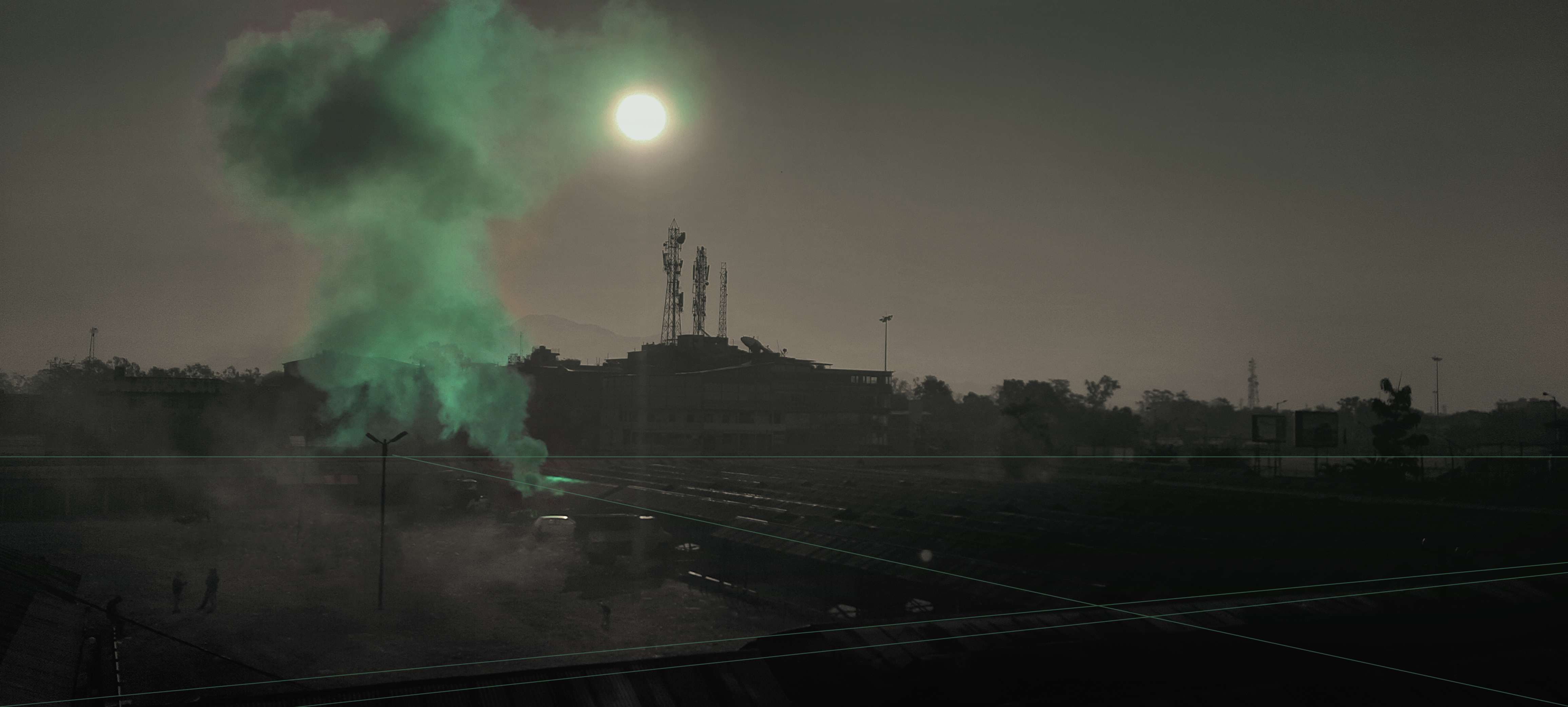 During this time he interacted with the farmers in the village as well as their children, and also observed, informed by his ongoing research, the precarious state that anthropogenic ecological crises have left the agricultural industry in. This experience led to his latest body of work on view here. He digitally manipulated and enhanced his photographs of the village landscape to highlight the effects of climate change, overproduction and deforestation. In his works, the villages are wrapped in smog—the result of the industrial activity in nearby areas—cutting off the sunlight that is vital to the survival of agricultural crops. Produce is vulnerable to untimely rainfall during harvest season, lightning, poor quality water supplied by the municipal council, and lack of availability of seeds, pesticide and farming equipment. Faced with potential harm from these multiple, varied sources, there is no assurance that the yield will match the hardwork and effort committed to the land by the farming community. Without required support from the state and increasingly unpredictable climatic conditions especially compound the uncertainty faced by farmers each year. The ourboratic relationship between climate change and industrial activity continues to threaten their livelihood, not to mention landlords who lease land to them in return for half of their produce, further depleting them of the result of their hard labour. The body of work presented here is an affective response by the artist to this situation.
